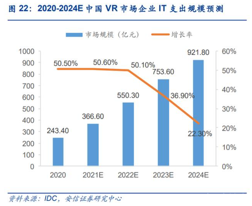 从具体落地来看,根据 IDC 的预测,我国 VR 市场企业 IT 支出规模预计将在 2024 年达 到 921.8 亿元,2020-2024 年 CAGR 约为 39.5%,行业处于高速增长期,具体到细分行 业,从 2019 年数据来看,VR 教育占比最高,达到 25.1%,其次是制造、零售、消费及 服务业。政策方面,教育部印发的《2019 年教育信息化和网络安全工作要点》中将 VR 技 术纳入教育信息化的年度重点工作任务。产业方面,根据华为 AILab 于 2018 年 6 月发布 的 VR 教育白皮书,国内的讯飞幻境已与 40 多家公立学校开展 VR 教育合作。