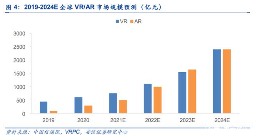 全球 VR/AR 市场规模已近千亿,未来五年 CAGR 达 54%。据 IDC 等机构统计,2020 年 全球 VR/AR 市场规模约为 900 亿元,其中 VR 市场规模 620 亿元,AR 市场规模 280 亿元。 中国信通院预测全球虚拟(增强)现实产业规模 2020-2024 五年年均增长率约为 54%,其 中 VR 增速约 45%,AR 增速约 66%,2024 年二者市场规模接近、均达到 2400 亿元。