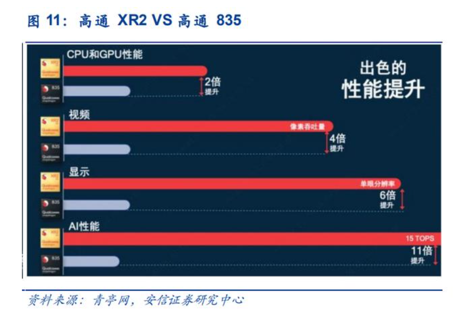 根据高通官方介绍 XR2 芯片性能:1)在视觉体验方面,XR2 平台的 GPU 可以 1.5 倍像素 填充率、3 倍纹理速率实现高效高品质的图形渲染;支持眼球追踪的视觉聚焦渲染;支持更 高刷新率的可变速率着色,可以在渲染重负载工作的同时保持低功耗;XR2 的显示单元可以 支持高达 90fps 的 3K×3K 单眼分辨率;在流传输与本地播放中支持 60fps 的 8K 360 度视 频。2)在交互体验方面,XR 2 平台引入 7 路并行的摄像头支持及定制化的计算机视觉处理 器;可以高度精确地实时追踪用户的头部、嘴唇及眼球;支持 26 点手部骨骼追踪。3)在音 频方面, XR2 平台在丰富的 3D 空间音效中提供全新水平的音频层以及非常清晰的语音交 互;集成定制的始终开启的、低功耗的 Hexagon DSP;支持语音激活、情境侦测等硬件加 速特性。4)除硬件平台外,高通还提供包括平台 API 在内的软件与技术套装以及关键组件 选择、产品、硬件设计资料的参考设计。