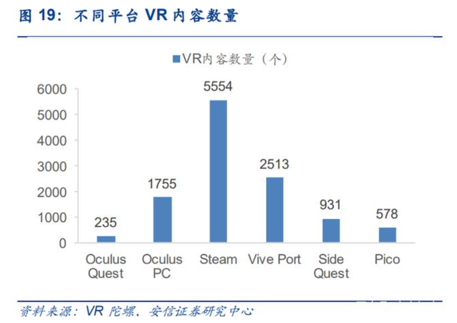 平台竞争主要取决于内容影响力与硬件渗透率,目前 VR 平台中影响力最大的为 Steam(内 容驱动)与 Oculus Quest(硬件驱动)。Steam 平台受益于 3A级VR 游戏《半条命:Alyx》 的推动,2020 年 VR 活跃用户大大增长,Valve Index 头显也供不应求。截至 2020 年 12 月, Steam 官方数据显示 Steam 平台会话数量达 1.04 亿次,总游戏时长增加 30%,新增用户达 170 万,VR 收入增长 71%,VR 月活超 200 万人。Quest 平台则随着 Quest 2 销量暴涨, 活跃用户数及平台收入一路暴涨,据 VRFocus 称,截至 2021 年 2 月,Facebook 公布 Quest 平台有超过 60 余款游戏收入达 100 万美元,其预计到 2021 年底平台累计收入将超过 5 亿美元。