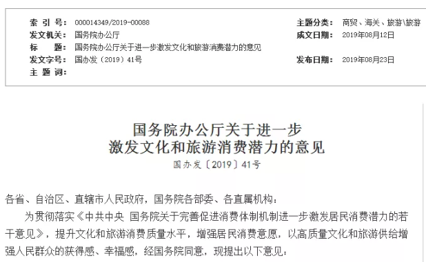 2019年8月23日,文化和旅游部等多部门印发了《关于进一步激发文化和旅游消费潜力的意见》,明确指出要努力使我国文化和旅游消费设施更加完善,消费结构更加合理,消费环境更加优化,文化和旅游产品、服务供给更加丰富。总体目标是顺应文化和旅游消费提质转型升级新趋势,深化文化和旅游领域供给侧结构性改革,从供需两端发力,不断激发文化和旅游消费潜力。