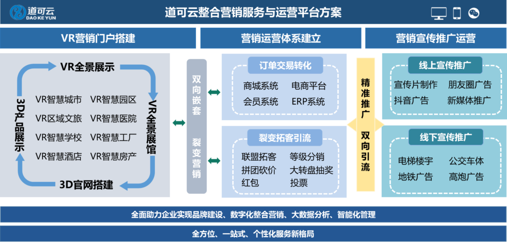 在5G时代来临之际,为助推区域文旅产业绿色健康协调发展,道可云采用3DVR虚拟技术、商城运营系统和全渠道的运营推广方案,将线下的各相关行业(旅游景区、特色民宿、商户、餐饮、酒店等)进行整合运营,打造区域性VR智慧文旅平台。