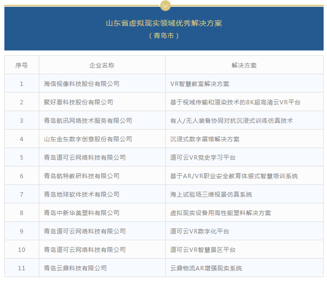 日前,由山东省工信厅组织开展的山东省电子信息产业高质量发展重点项目评选工作已经完成。山东省2022年电子信息行业重点领域解决方案和应用示范项目名单也于近日公布,青岛市共9家公司的11个项目在列,道可云的“VR党史学习平台”、“VR数字化平台”和“VR智慧景区平台”三项技术成果成功入围。