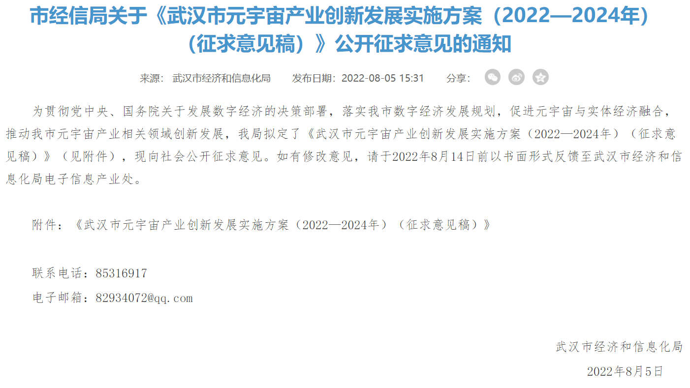 8 月 5 日,武汉市经信局印发《武汉市元宇宙产业创新发展实施方案(2022—2024 年)(征求意见稿)》公开征求意见通知,旨在促进元宇宙与实体经济融合,推动武汉市元宇宙产业相关领域创新发展。