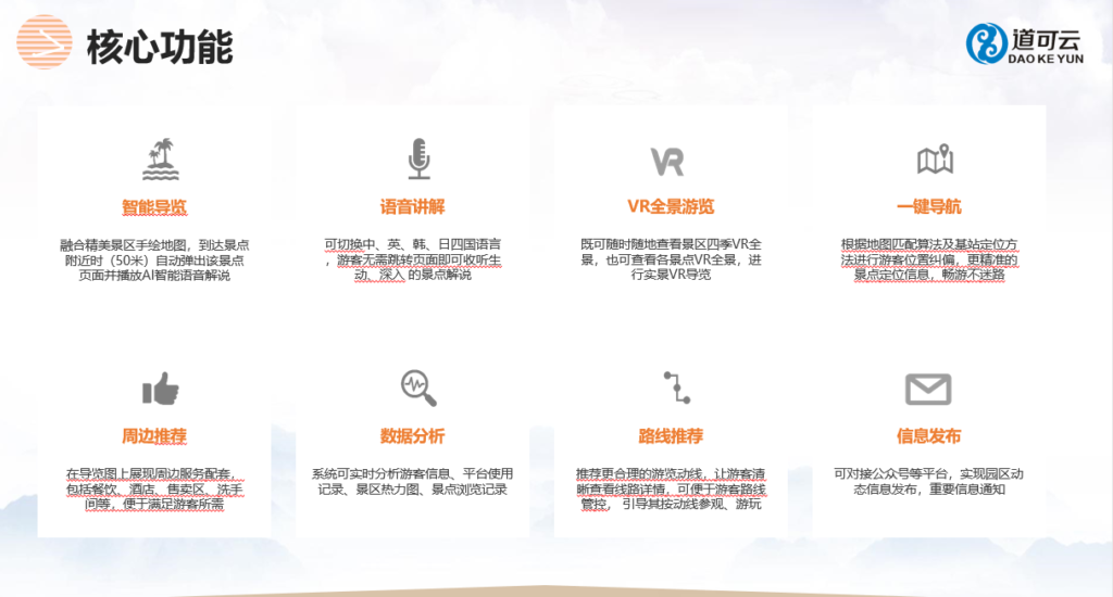 VR智慧景区导览系统平台是道可云以智慧旅游概念策划设计的集“景区手绘地图、景区导览、景点科普、智能导航、VR全景游园、公共服务、预约购票、周边推荐、大数据分析”等要素为一体的智慧景区平台。(涵盖大屏端、移动端等)它将AR技术与GPS导航、数据库、语音合成、在线购物、互动娱乐等多种服务融合在一起,为游客提供便捷、智能、全面的导览服务。系统平台包括以下组成部分:
