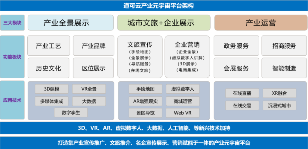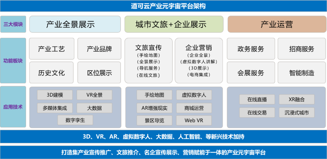 为赋能城市、产业、企业数智化转型,更好地实现政府监管和产业扶持、产业赋能。道可云基于3D、VR、大数据、人工智能、虚拟数字人等新兴技术,打造了集产业全景展示、名企宣传、产业运营、招商推介于一体的产业元宇宙平台。通过全要素数字化汇聚、全链条数字化融合、全主体数字化赋能,助力传统产业链转型升级,实现城市产业职能的服务和技术升级、产业的链条价值重塑。