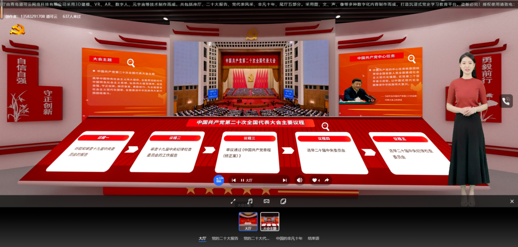 作为国内领先的元宇宙党建方案公司,道可云以中宣部、中共中央党史和文献研究院、中央档案馆等权威机构发布的党史内容为核心,利用元宇宙、VR、3D等技术制作了中国共产党百年党史展馆、中国共产党第二十次代表大会元宇宙展厅、中国共产党章程学习平台、“习近平新时代中国特色社会主义思想”主题教育展馆、“习近平强军思想”学习平台等数字化内容,在北京、上海、青岛等地的各级党组织都得到了广泛应用。同时,还可面向不同的政企客户提供数字内容定制服务和智慧党建整体解决方案。
