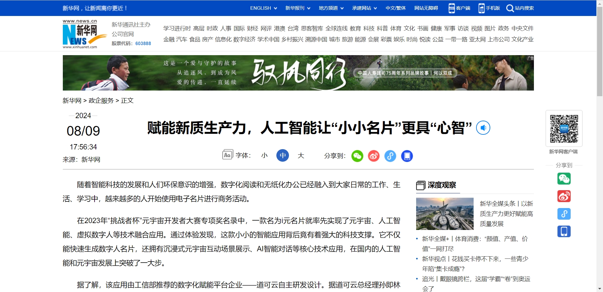 在人工智能技术不断迭代的能力增强和应用场景需要落地的背景下,作为国内领先的创新元宇宙和Ai公司,道可云在业内率先推出了融合元宇宙、数字人和Ai技术的数字人名片。近期依托大模型能力和私有知识库训练的智能体功能实现了i元名片的创新升级,在国内的人工智能和元宇宙发展上突破了一大步。该应用一经发布便受到了大家的广泛关注,并在会展、招商、企业营销等各领域得到了广泛应用,新华网也对其进行了深度报道。以下是新华网报道原文: