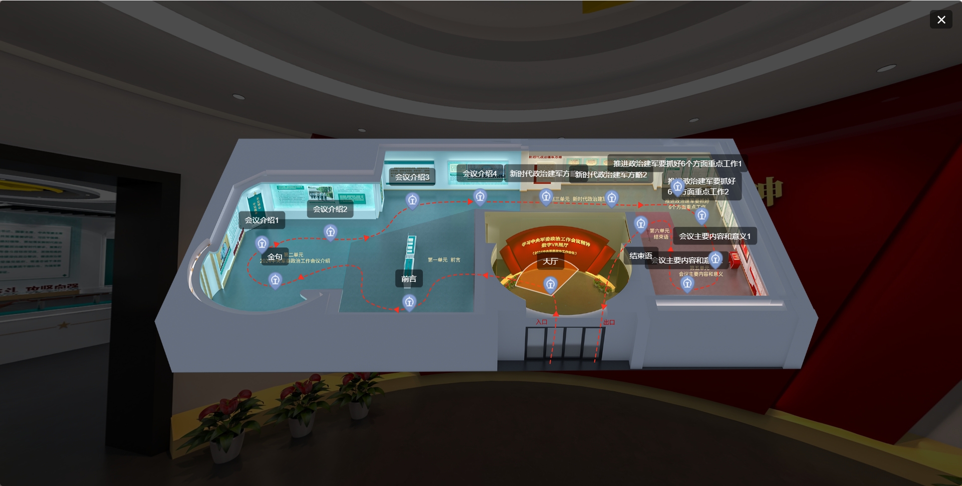 学习中央军委政治工作会议精神VR数字展馆以中国政府网、中国军网、新华社、国防部等单位公开发表的内容为核心,采用元宇宙、VR虚拟现实、数字人智能讲解等技术进行规划建设,共包括序厅、会议概况、会议精神展区、新时代政治建军方略、结束语等内容,选取与军委工作会议相关的历史文物进行展示,如会议文件、照片、纪念品等,图文声像互补、沉浸立体的展示了军委工作会议的历史和精神内涵。