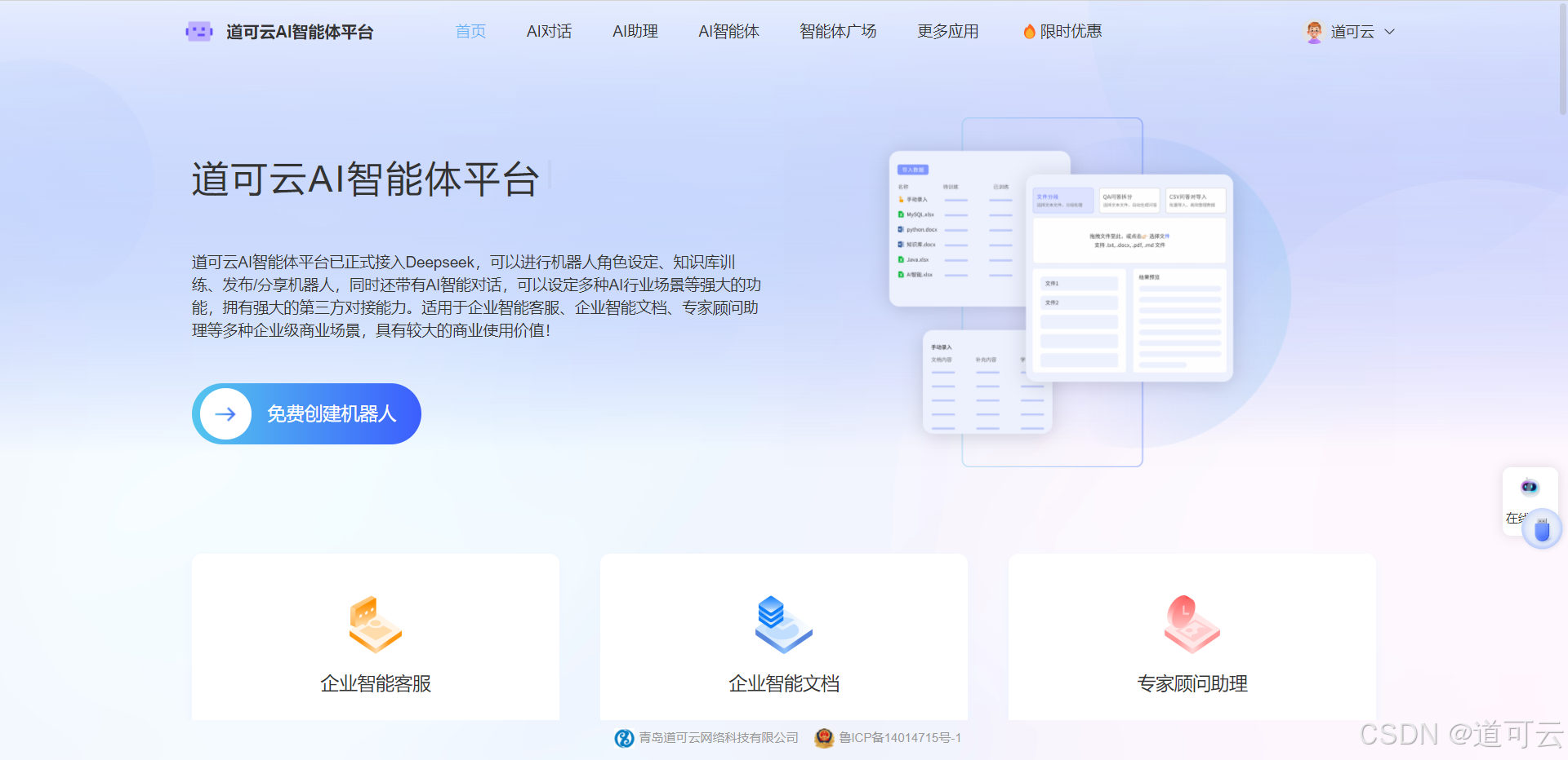 首先进入道可云AI智能体平台官网:AI智能体官网,点击【免费创建机器人】