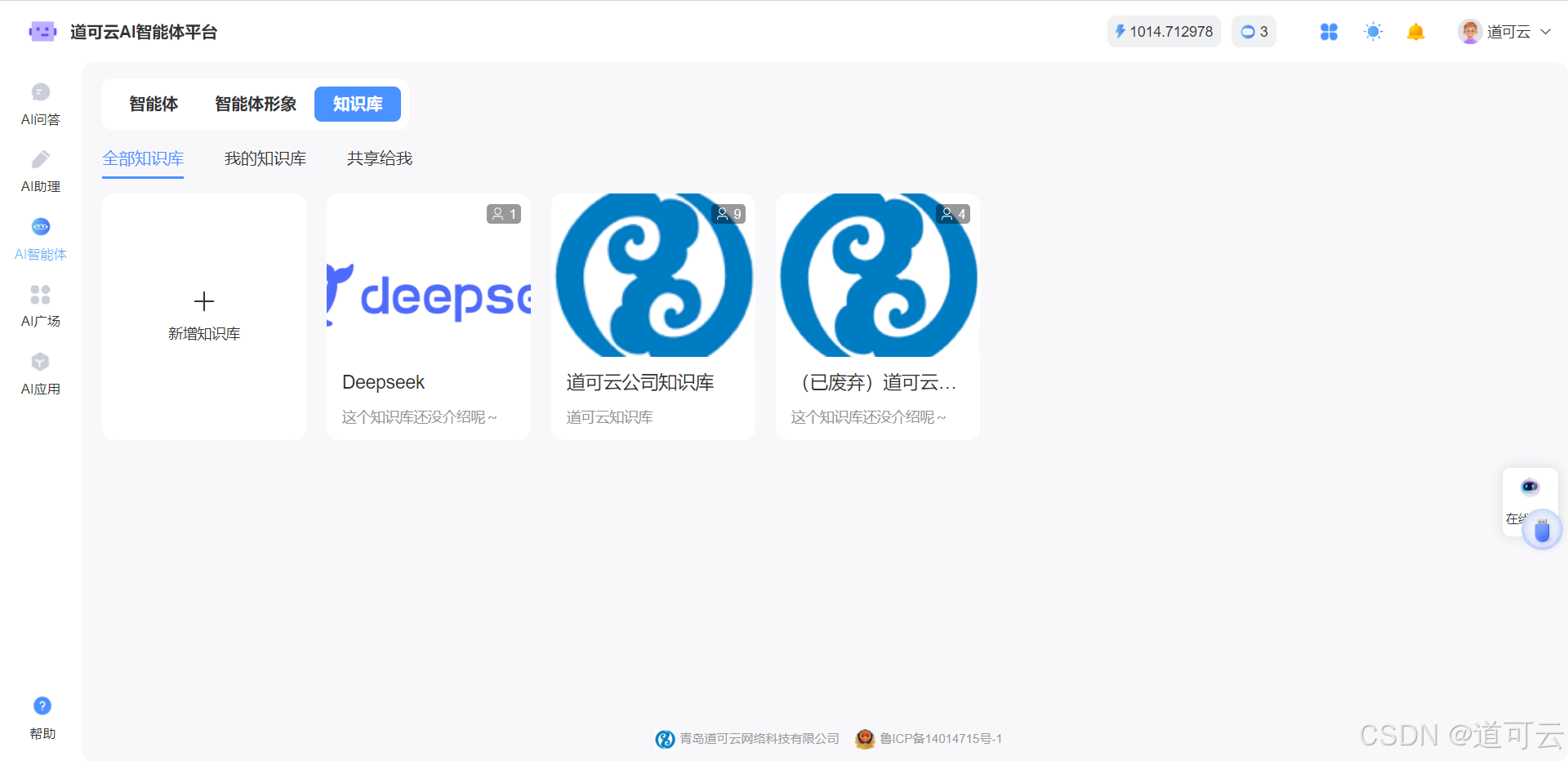 第二步:点击左侧菜单【AI智能体】,再点击【知识库】,新建知识库即可(模型可选择DeepSeek V3或R1)。然后导入数据就可以了。