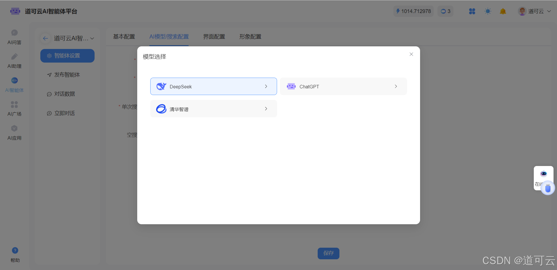 第三步:点击左侧菜单【AI智能体】,再点击【智能体】,新建智能体即可,注意关联刚才新建好的知识库。在模型搜素配置AI模型中选择DeepSeek即可。
