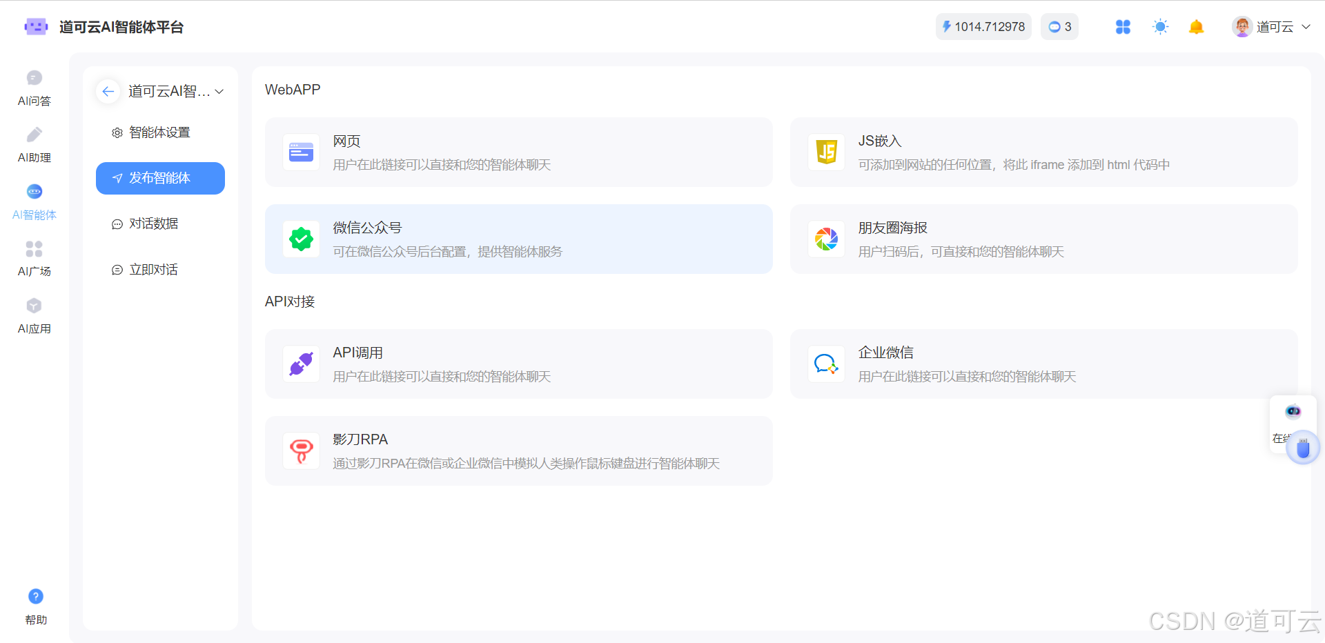 基于人人都可拥有DeepSeek智能体的理念,道可云AI智能体平台开放企业、媒体、政府等各类组织和个人注册服务(点击免费注册https://aiwork.daokeyun.com/?user_sn=68881389),注册即送10个算力和一个智能体,无需认证,可使用平台全部功能。简单而言,DeepSeek智能体其实用自己的公司资料训练一个知识库挂到一个智能体,然后选择智能体对接DeepSeek,放到官网、公众号等渠道,这就真正对接到DeepSeek了。