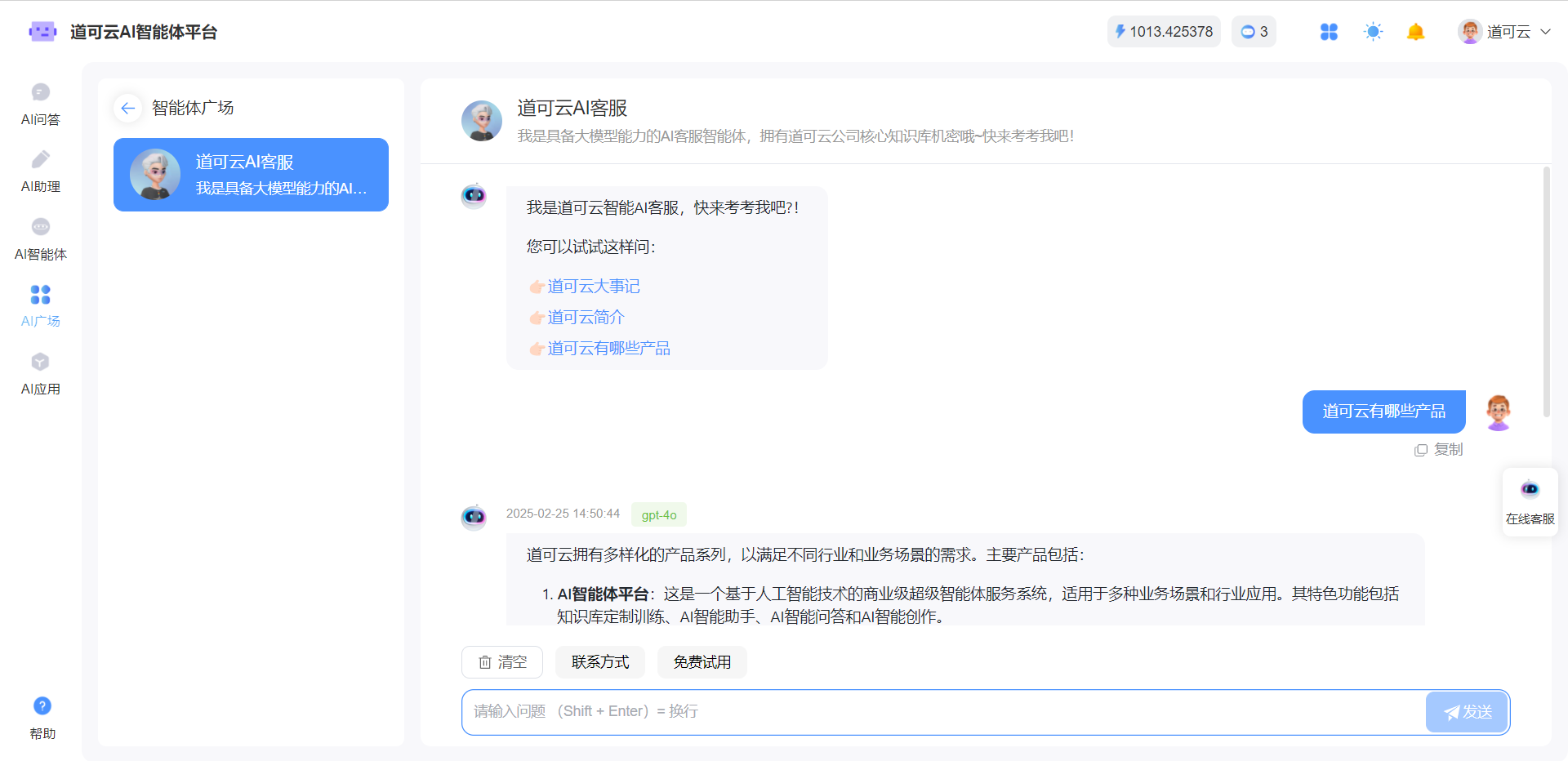 道可云AI智能体平台真正做到了帮助企事业单位低成本接入DeepSeek,更融合了丰富的知识和个性化的互动方式,为用户带来了前所未有的智能体验。接入DeepSeek的智能体回复内容丰富而深入,既能够直接回应客户问题,又能够引导客户下单成交。欢迎注册购买体验~