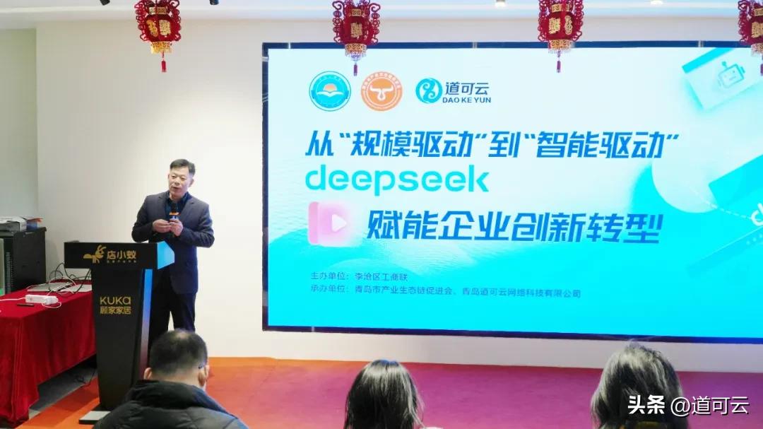 3月12日下午,由李沧区工商联主办,青岛市产业生态链促进会、青岛道可云网络科技有限公司承办的从”规模驱动”到“智能驱动”——Deepseek赋能企业仓创新转型分享会,在金海牛能源环境产业园顺利举办。