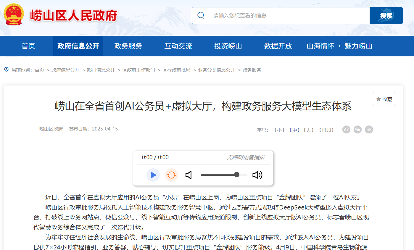 其自主研发的AI数字人平台内置丰富的数字人形象和表情库,高精度的语音合成技术使口型匹配准确率超98%。还可深度关联AI智能体和知识库,帮助政府部门打造“会思考、懂政策、可交互”的智能数字人,实现从业务咨询到政务信息查询等全流程服务智能化。其中,山东省首个“AI公务员小易”便是这一技术的典型应用,融合了道可云领先的虚拟形象制作、虚拟语音交互和业务流程自动化能力,受到各界一致好评。