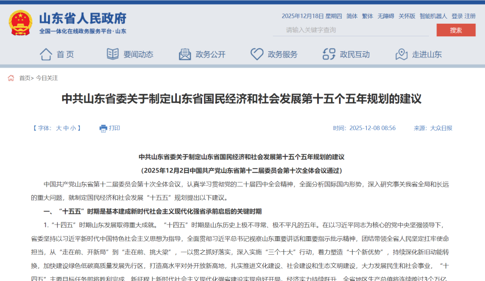 《中共山东省委关于制定山东省国民经济和社会发展第十五个五年规划的建议》(以下简称《建议》)正式发布,为未来五年山东经济社会发展绘就了宏伟蓝图。《建议》系统总结了“十四五”时期的重大成就,深刻剖析了“十五五”时期的历史方位与新形势,并以前瞻性的战略视野,提出以“十大工程”为抓手,推动山东在基本建成新时代社会主义现代化强省的征程上取得决定性进展。通览全文,创新驱动与产业升级的主线贯穿始终,其中人工智能作为引领新质生产力发展的关键引擎,被赋予了前所未有的战略权重。