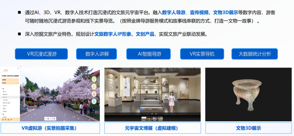 沉浸式体验升级:通过VR全景游园、AR互动场景开发以及AI数字人导游服务,打破物理时空限制,让游客在行前、行中都能获得深度、互动的文化感知。数字人导游不仅提供不间断的智能讲解,更能根据游客兴趣进行个性化路线推荐与内容解说。