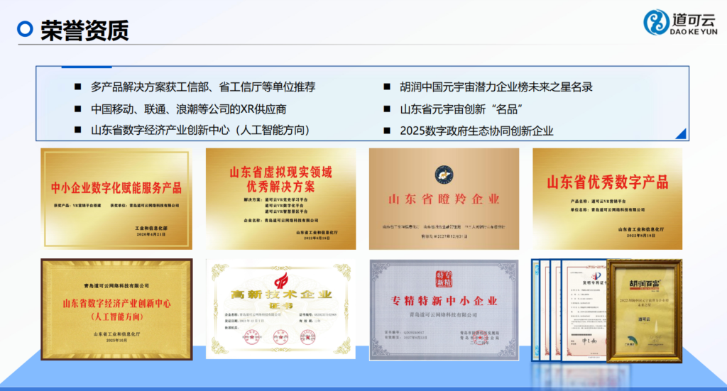 淄博“五好城市”文旅品牌建设:在淄博打造“五好城市”品牌的过程中,道可云提供了从线上元宇宙空间搭建到线下智慧体验升级的整体方案。围绕“吃、住、行、游、购、娱”全要素,通过VR全景、数字人推介等方式进行立体化宣传推广,有效放大了“淄博现象”的品牌效应。