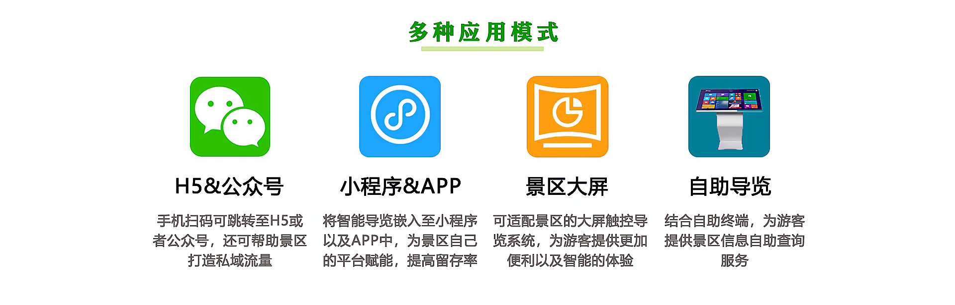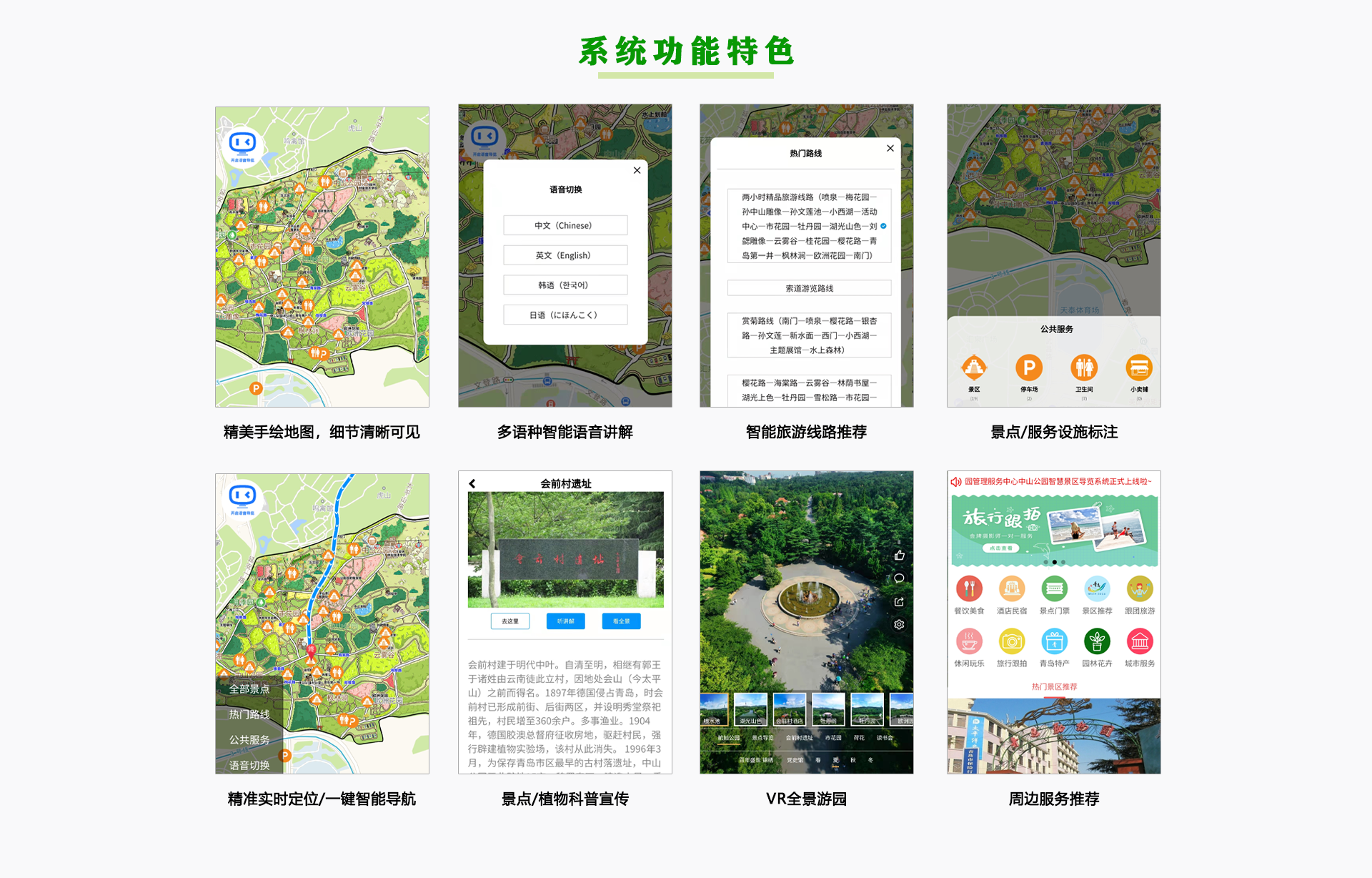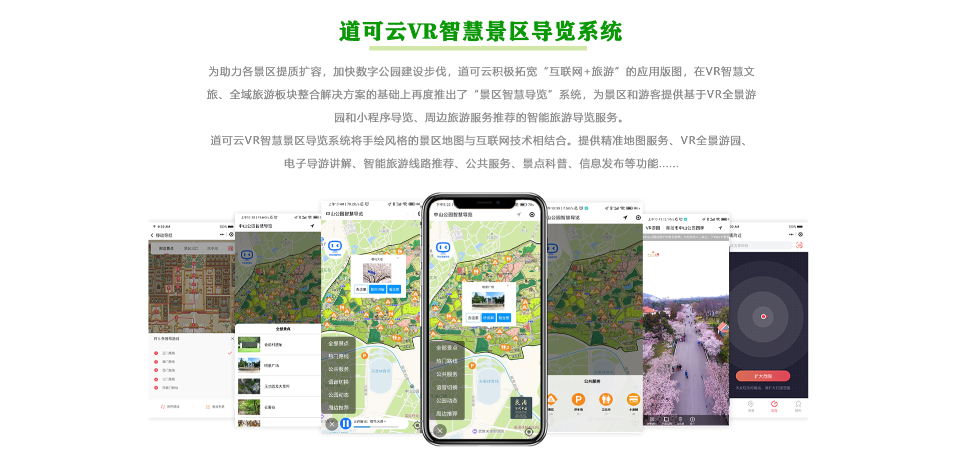 道可云景区导览系统结合景区IP形象,将手绘风格的景区地图与互联网技术相结合。提供精准地图服务、VR导览、电子导游讲解、智能旅游线路推荐、公共服务、景点科普、信息发布等功能,游客可通过扫码或者关注公众号即可使用。让游客们能在游览景区时有更加便捷、更加流畅、更加真实的旅游体验,同时也可通过大数据技术帮助景区科学统计各景点旅游人数,实现小程序与VR游园系统、公众号、网站的深度嵌套,为景区进行功能定制。